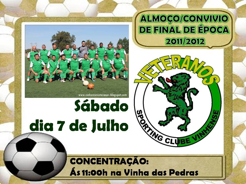 Informa-se todos os elementos que fazem parte do grupo/plantel de veteranos do S.C.Vinhense que o almoço/convívio de final de época irá decorrer no próximo sábado, dia 7 de Julho.