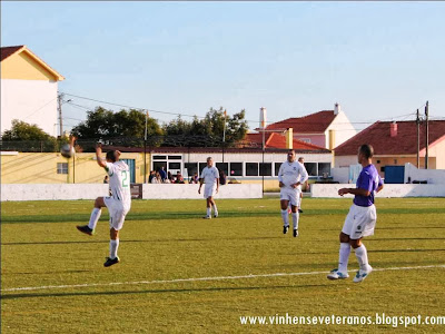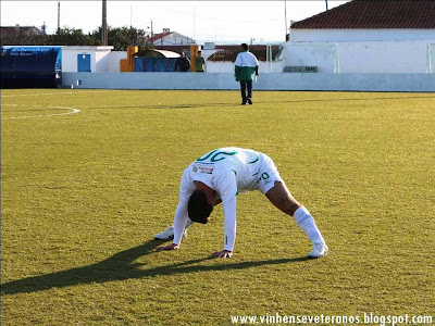 Sei que já foi no mês passado, mas as novas tecnologias têm destas coisas. Ninguém me avisou que para ter internet era preciso pagar e deu nisto... mas adiante, sábado dia 30 de Novembro deslocámos-nos à Quinta do Conde para defrontar a equipa de veteranos da A.D.Q.C. num final de tarde bastante frio. Mais uma vez com o plantel praticamente todo reunido, sem baixas no departamento médico, o nosso special one continuava um treinador feliz e em estado de graça. Desde o primeiro minuto de jogo, as equipas mostraram-se muito equilibradas, com o jogo a desenrolar-se principalmente no meio campo e mesmo com a bola a rondar as duas áreas, não se viam lances de grande perigo para os guarda redes. A nossa equipa apresentou-se organizada, com momentos de muito bom futebol, mas com momentos de desconcentração e nervosismo. Mesmo sabendo que só iriam entrar em jogo na 2ª parte, os nossos suplentes iniciaram cedo o aquecimento e antes de haver qualquer golo na partida já eles tinham metido meia dúzia (para dentro). Deviam ser os brindes para o Anónimo... A meio da 1ª parte chegámos à vantagem por intermédio de Rui Branco, que ficou cara a cara com o guarda redes adversário e só teve de desviar para o fundo das redes. Nada se alterou na forma de jogar das duas equipas, e em cima do final do 1º tempo, a equipa da casa chegou ao empate, na conversão de um livre directo. Zé Luís nada pode fazer para evitar o golo. Zé Almeida, voltou a perder a cabeça, desta vez com o Mister Babló e protagonizou mais uma daquelas cenas teatrais. Resultado.... o Mister danado com ele, ao intervalo tirou o João Baião.... No final da 1ª parte, empate a uma bola perfeitamente ajustado, perante a prestação das duas equipas.