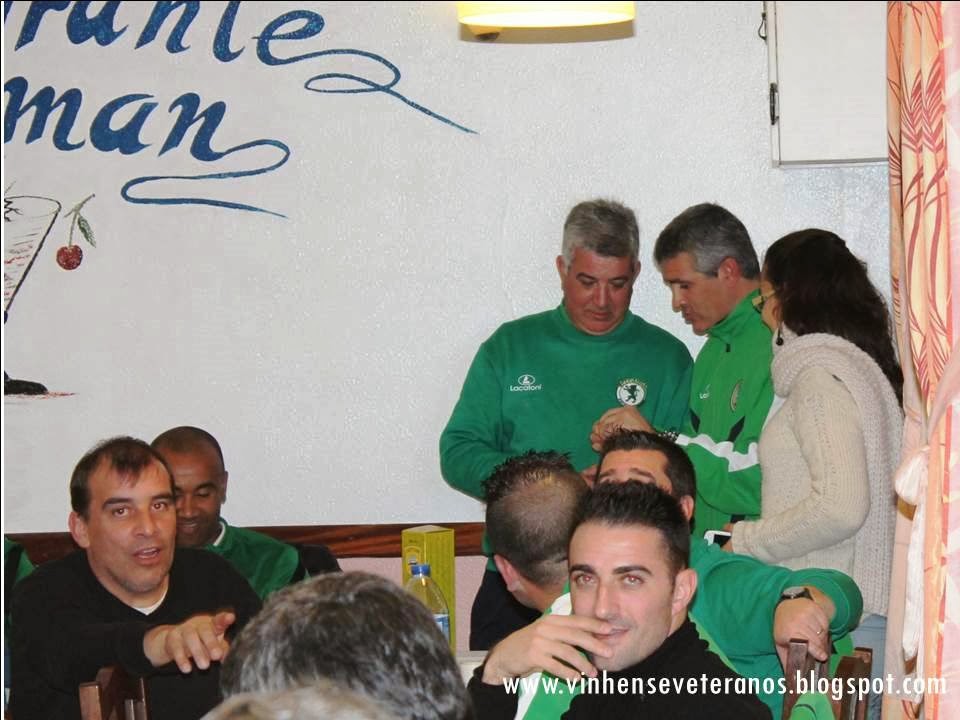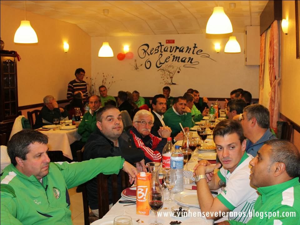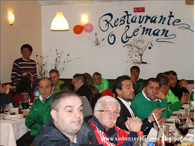 O jantar decorreu no local do costume com a televisão a transmitir mais uma vitória do Sporting e com o resultado felizmente já esquecido. De salientar um grupo que vai ganhando voz, liderado por um rapazinho do bairro das Palmeiras que afirma estar habilitado a substituir o actual treinador. Este grupo que já tem um director desportivo, um homem das finanças e um dos capitães da equipa, foi ganhando voz e mostrou lenços, toalhas e lençóis brancos, pedindo a cabeça do Mister (mais valia pedirem os pés que dão pouco trabalho, a cabeça tem a boca e ele come muito). No final foi-lhe dado mais um voto de confiança, pelo menos até alguém descobrir onde é que compra as chamussas. É que a deslocação a Montargil é já no próximo mês!!! Também já está a ser investigado o sorteio da garrafa em que foram escolhendo os números até sair o do Sr. Eduardo Rosário....vergonhoso. Está quase ao nível daquele sorteio em Mora em que ninguém viu nem sorteio nem prémio.... Para terminar, um grande abraço ao Peguinho que pôde voltar a estar connosco, embora ainda em liberdade condicional. Esteve presente mas não foi possível ir ao jantar. Tem calma miúdo, acredito que depois do Natal já estarás completamente livre..