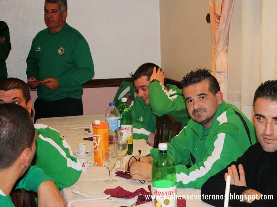 Na 2ª parte o banco de suplentes ficou mais calmo e o terreno de jogo um pouco mais incendiado. Em termos de futebol as coisa pareciam estar como no 1º tempo, mas perdeu-se muito tempo com picardias e pressões sobre o árbitro (neste aspecto Paulo Amaral e Babló foram incansáveis). Logo a abrir, Paulo Amaral levou a bola a embater com estrondo na trave da baliza adversária, mas na sequência de um pontapé de canto, uma valente cabeçada de Eduardo colocou-nos novamente em vantagem. A vantagem não durou muito, pois poucos minutos depois, numa boa jogada de contra ataque, a equipa da casa repôs a igualdade. Já perto do final da partida e quando parecia que o marcador não se iria alterar, a equipa da Quinta do Conde voltou a marcar e estabeleceu o resultado final em 3-2. No final da partida a contestação ao treinador não subiu de tom pois a malta juntou-se em pequenos grupos para falar baixinho e tentar fazer-lhe a folha, pois é, porque neste clube as vitórias são nossas e as derrotas são dele (já nem as chamussas lhe salvam). Agora vêm duas provas de fogo, dois jogos de mata mata. Espero o melhor para a nossa equipa, mas palpita-me que no Natal o predestinado Mister nem em Moçambique terá descanso pois até lá o Vinhense tem adeptos que o vão querer linchar (somos mais que o Benfica). Depois do jogo teve lugar uma confraternização com a equipa adversária, com um lanche para recuperar forças. Um obrigado á equipa da A.D.Q.C..